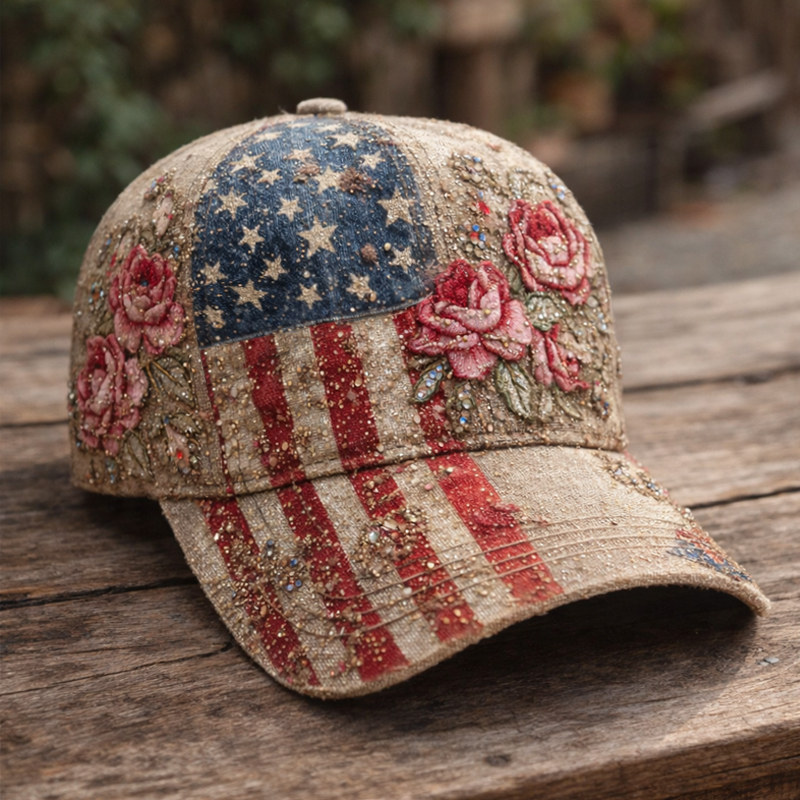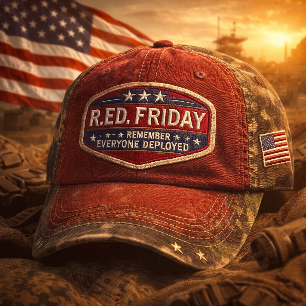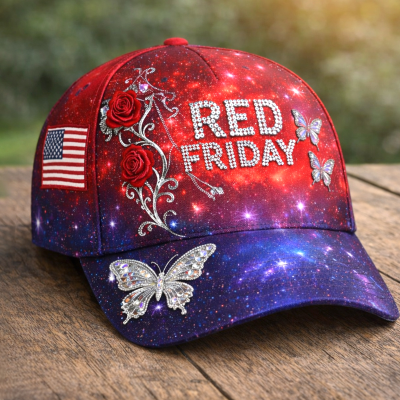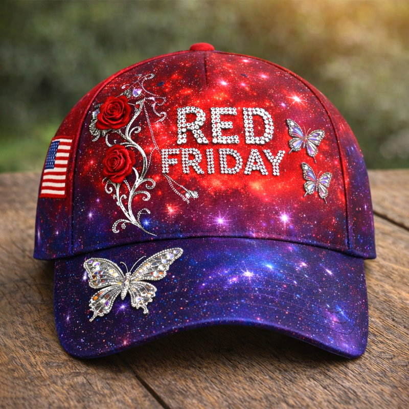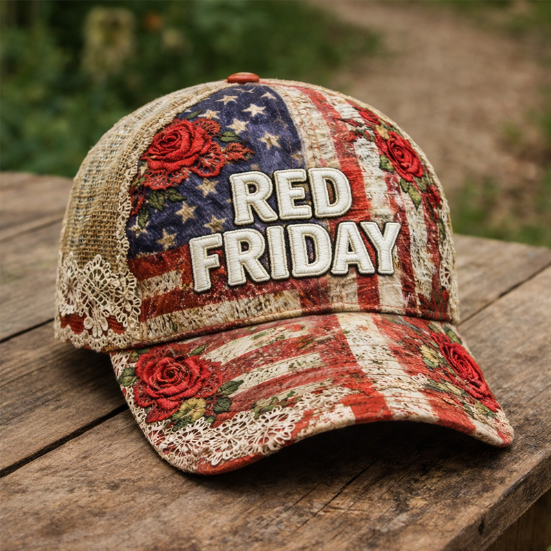 • Denim Patchwork Floral “Red Friday” Baseball Cap
