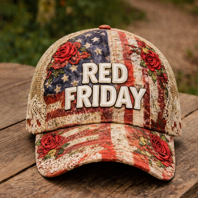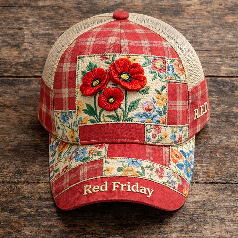 • Red Plaid Patchwork Floral Embroidered “Red Friday” Trucker Cap