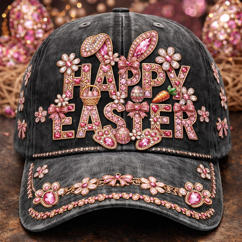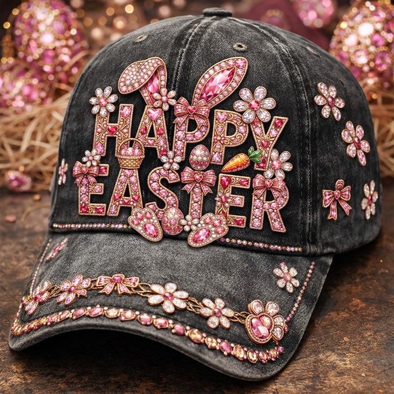 • Vintage Washed Rhinestone “Happy Easter” Bunny Floral Baseball Cap
