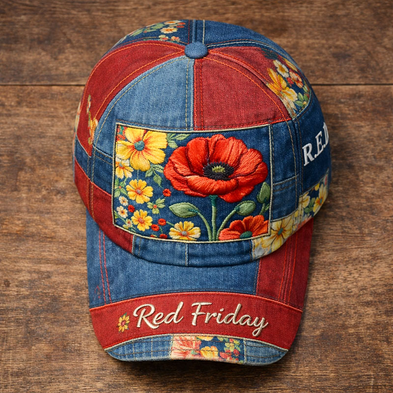 Denim Patchwork Floral “Red Friday” Baseball Cap