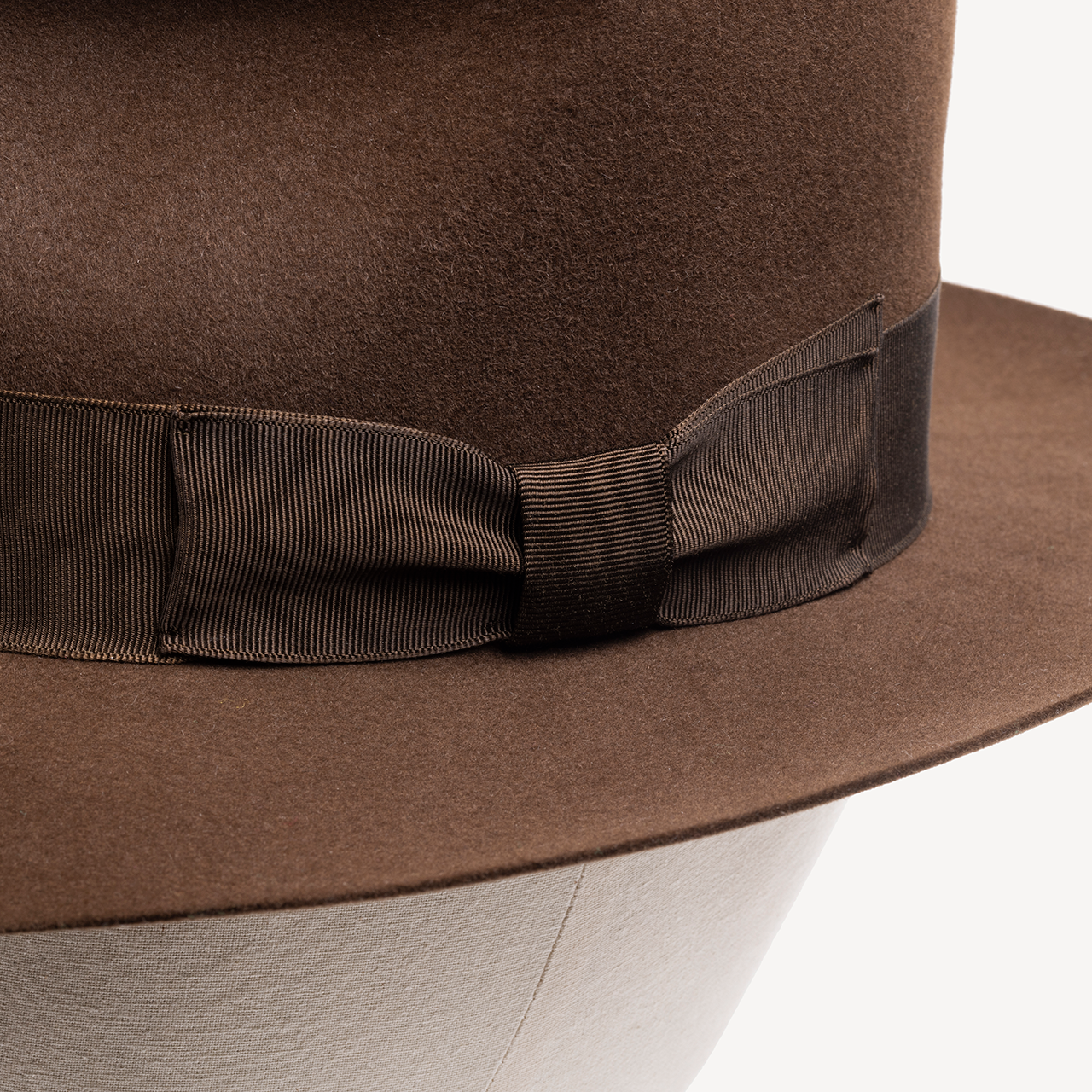 Crafted from our Nutmeg fine rabbit fur felt with a sable brown ribbon. Reminiscent of the 1960s style, these timeless hats are completely handcrafted to order for each client by the highly skilled hatters at Herbert Johnson.