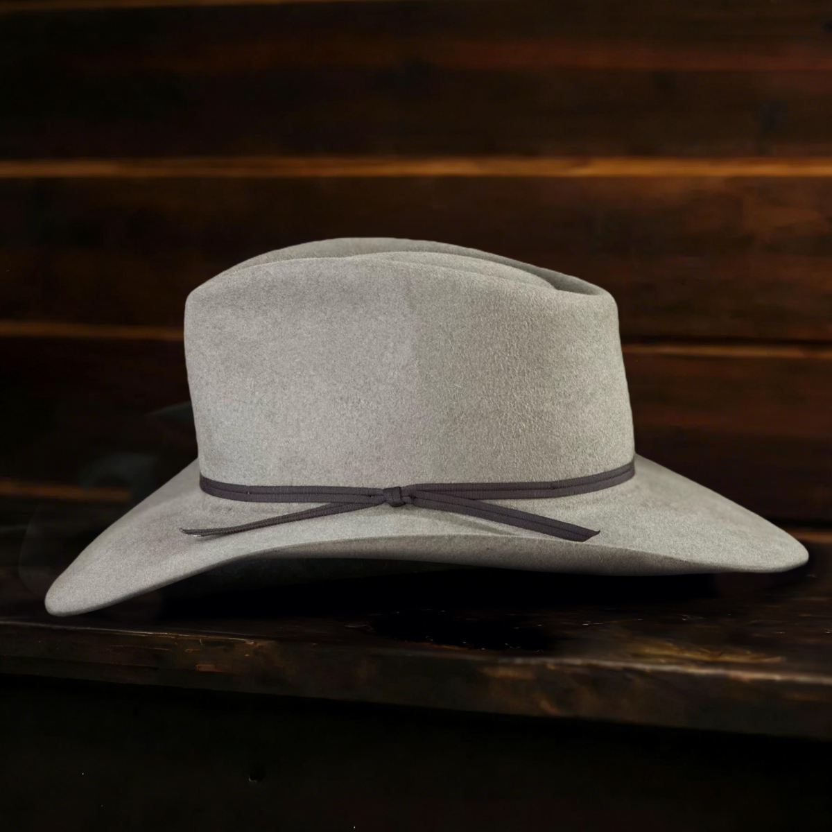 Here’s a pure beaver in the Natural color that turned out well for a local resident. The pinched front crown is 3.75” in the front and slopes to 3.5” in the back. The 3.5” brim has a nice belly roll with a slight curl of the brim toward the back. A chocolate two ply ribbon finishes it off. This one has that sassy Aussie with the low brim over the eyes and will stand up to the extreme Wyoming weather.