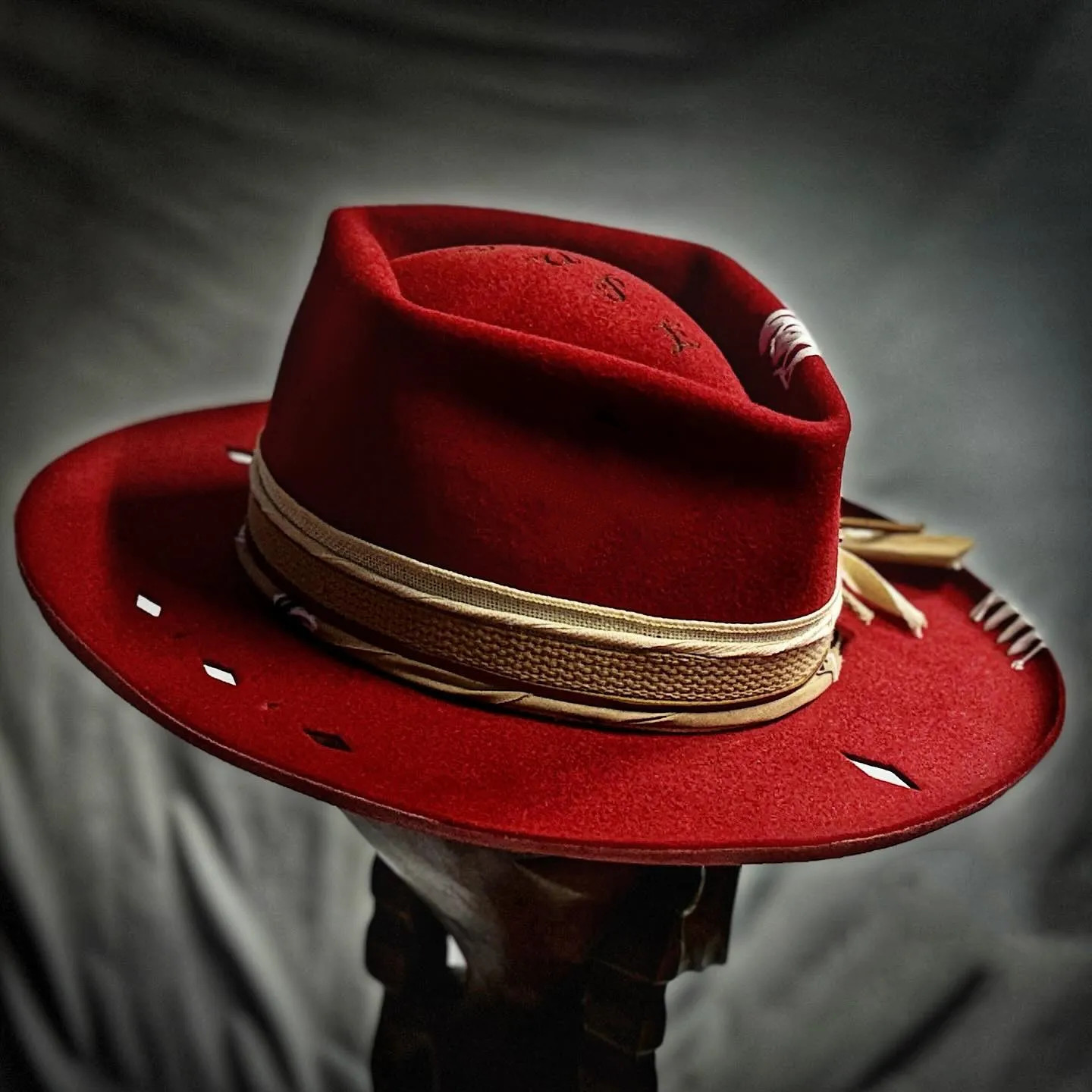 "Unleash your wild side with Alanisse III, a hat crafted from luxurious 100% rabbit fur felt. Featuring a striking 4.5" crown, a bold 3.5" brim, and a vibrant red hue, this hat is a fearless statement piece that radiates confidence and style. The 2" hand-sewn sheep leather sweatband ensures a comfortable and secure fit, while the entirely handmade construction adds a touch of individuality.