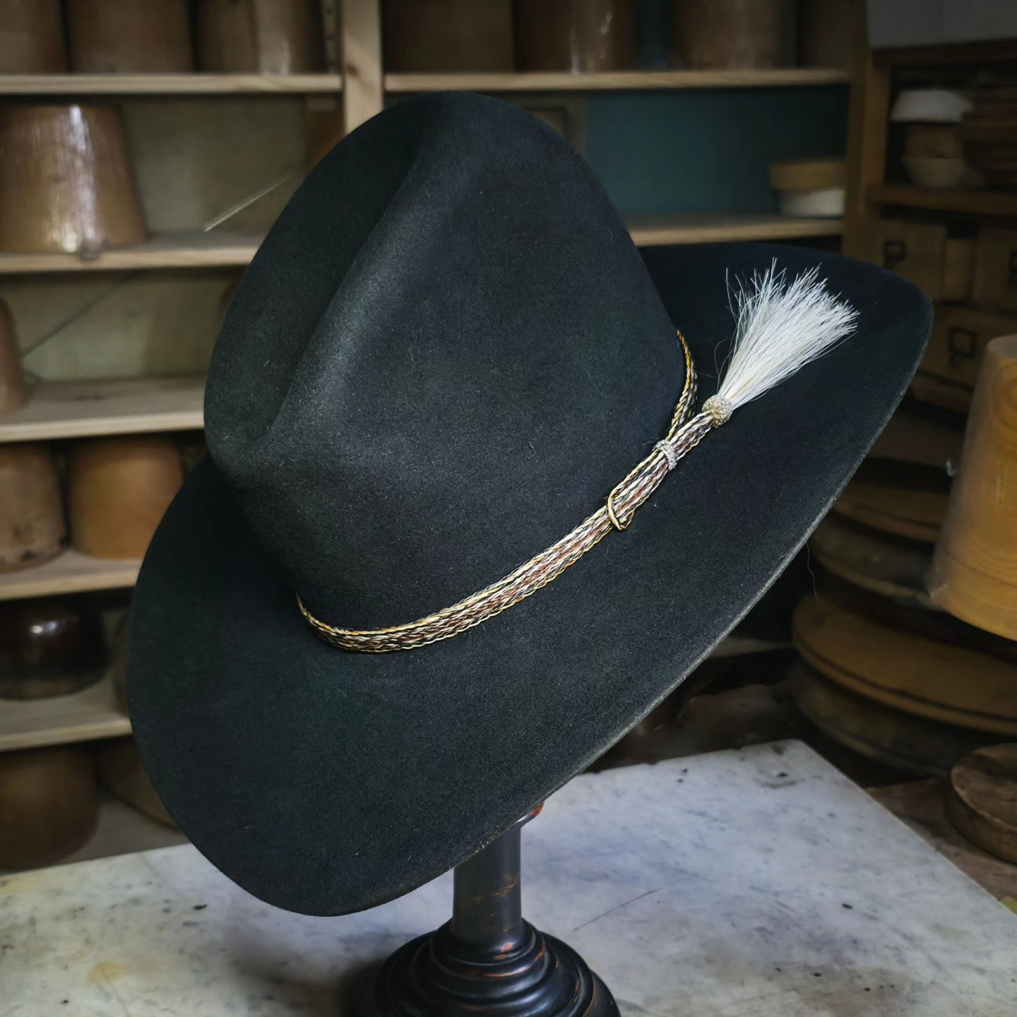 The Midnight Gus features a tall Gus crown crafted from deep blue-black nutria felt, delivering a bold yet timeless Western silhouette. Clean lines, balanced proportions, and a rich, dark tone give this hat an unmistakable presence without unnecessary embellishment.
