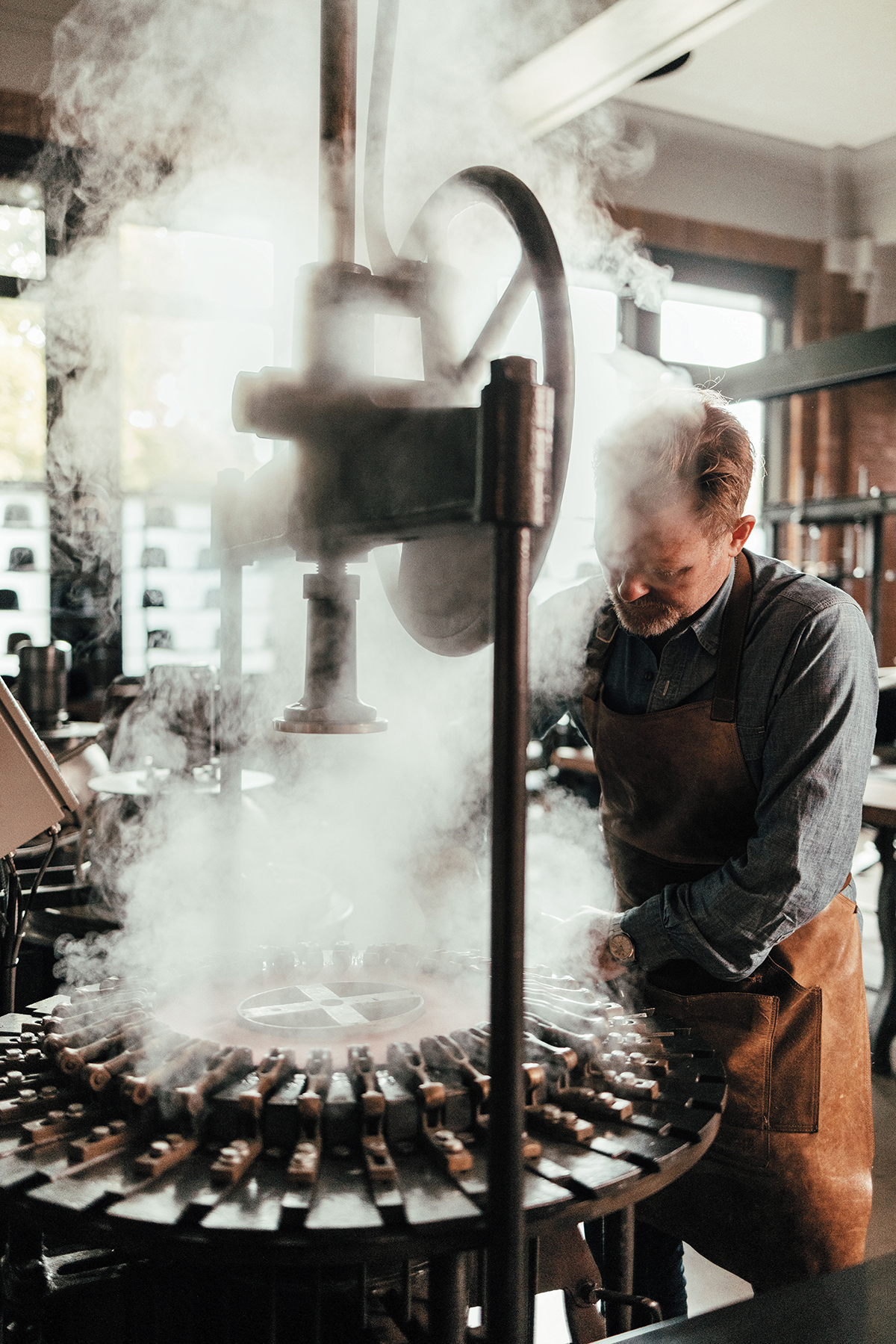 The next step, called blocking, creates the initial structure. An inverted hat body is placed into a 1940s blocking machine that Thompson sourced from Germany. The material is then steamed, and a domed mold called a hat block is plunged into the felt, forcing it into the desired size and shape.