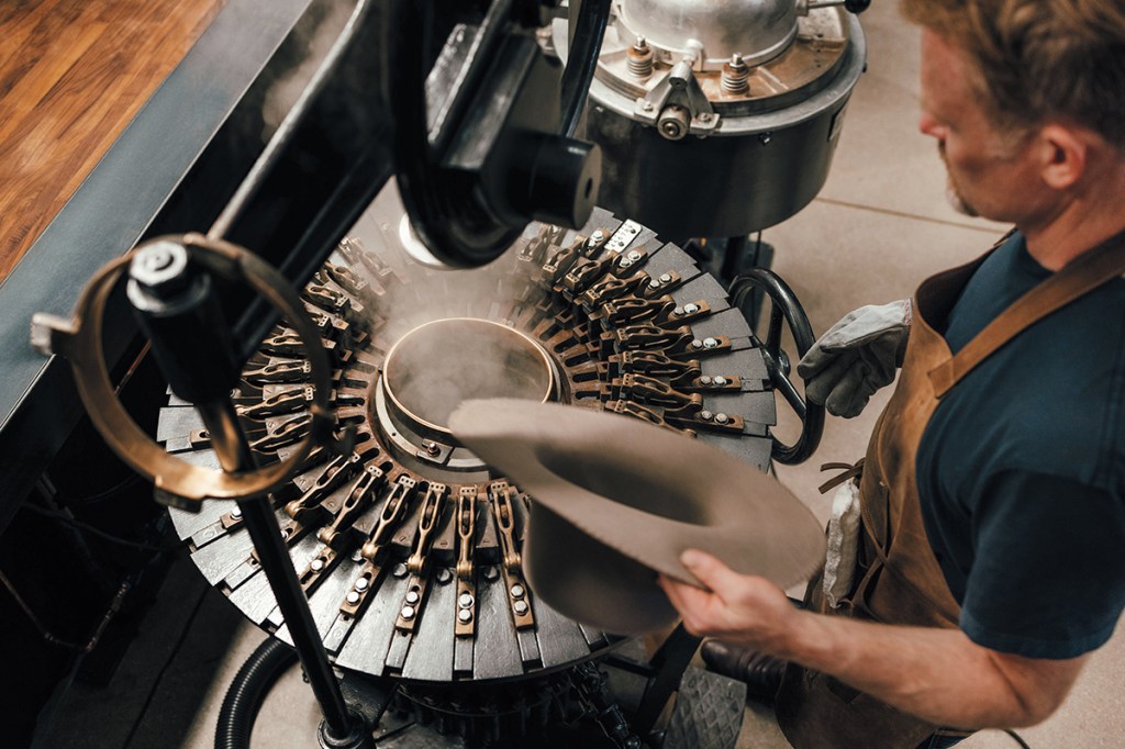 The blocked hat body is put through a secondary blocking, called decatizing, in which it’s steamed again and then slowly “baked” in a decatizing machine. “I would liken it to a curing of the fabric,” Thompson says. “This process makes the felt more resistant to shrinkage and prevents the shape from being knocked out of it. Just to do that step is very expensive and requires a lot of additional molds.”