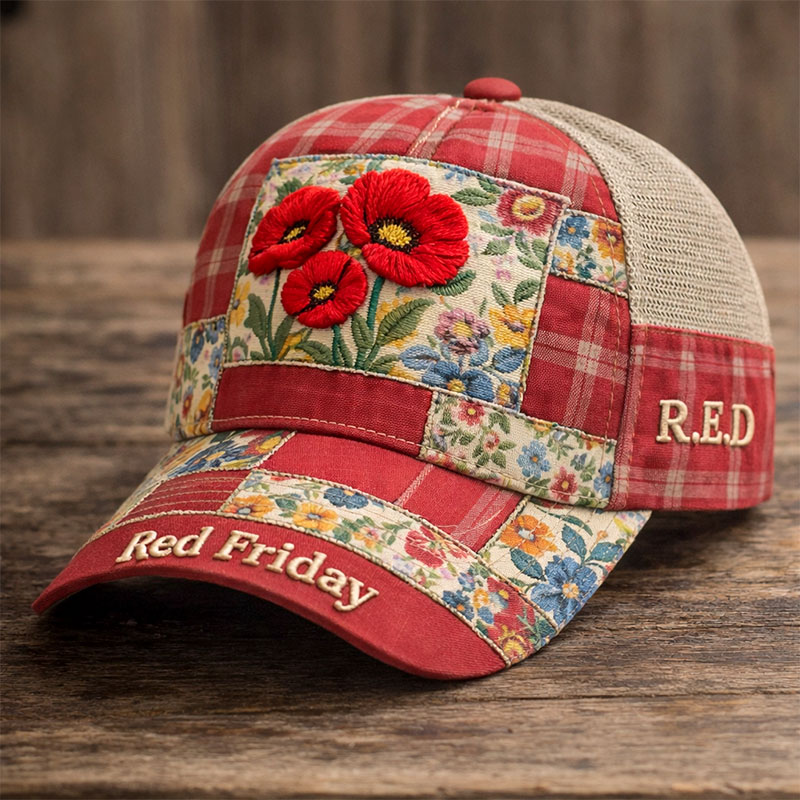 Red Plaid Patchwork Floral Embroidered “Red Friday” Trucker Cap