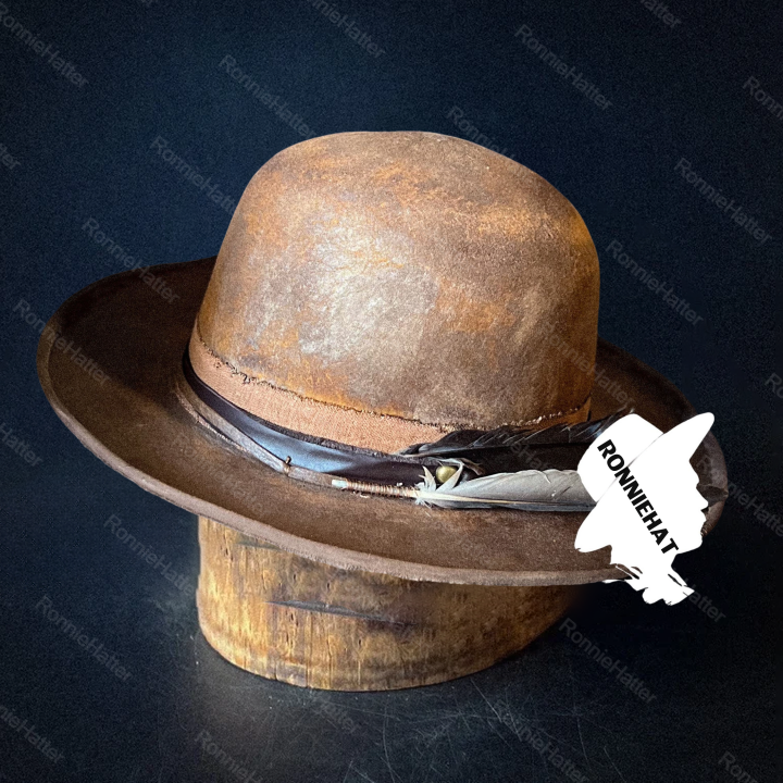 The “Big Sur Big Sir” is a heavily distressed cowboy hat size 7 5/8. Made from 100% wool, stiffened to the makers liking. Open crown style with a slight pencil curl around the brim. Layered banding with distressed cloth, hand cut leather and a leather lace. The feathers are found feathers from the shores of the Big Sur area. Brim is approximately 3 1/4 inches wide.